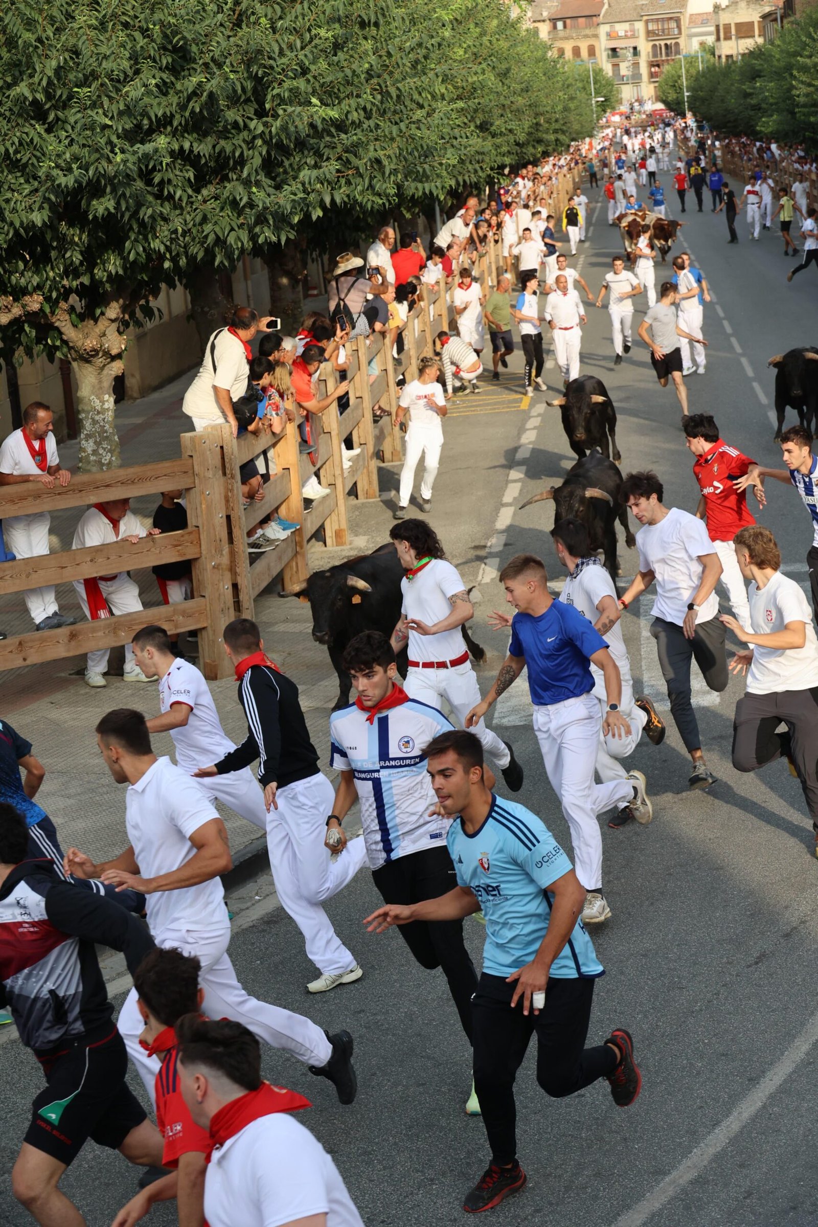 Puntual, un día más, a las 9 de la mañana ha roto el cohete en el cielo tafallés y la manada al saltado al asfalto muy hermanada. Uno de los cuatro cabestros de hoy, ha tropezado nada más salir, cayendo al suelo; sin embargo, se ha levantado ágilmente y como si ahí no hubiera pasado nada. Los mozos, que esperaban, como cada día, la salida de los animales a porta gayola, han podido disfrutar corriendo desde el primer momento.