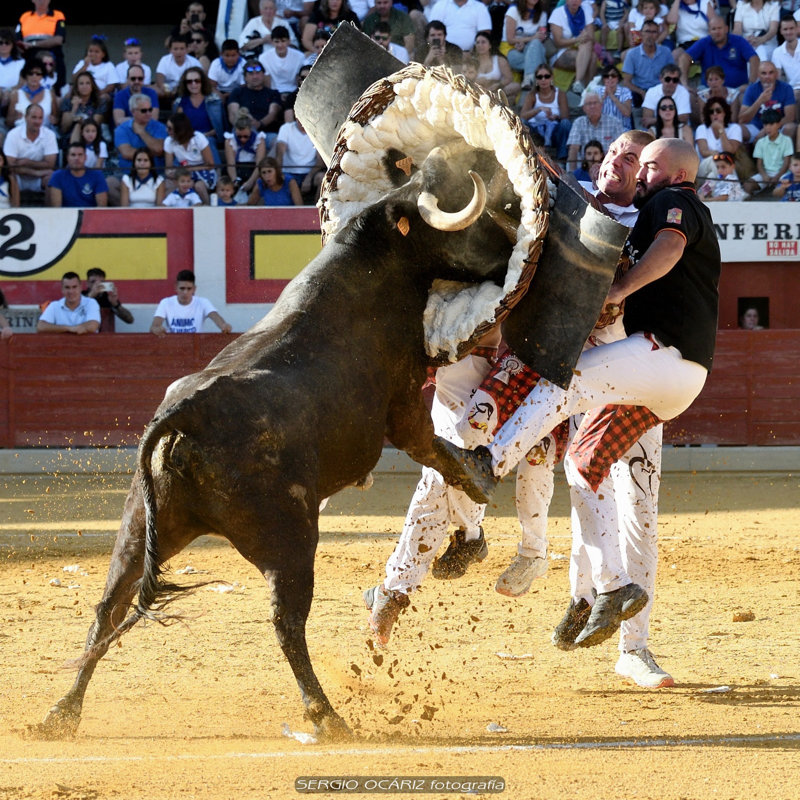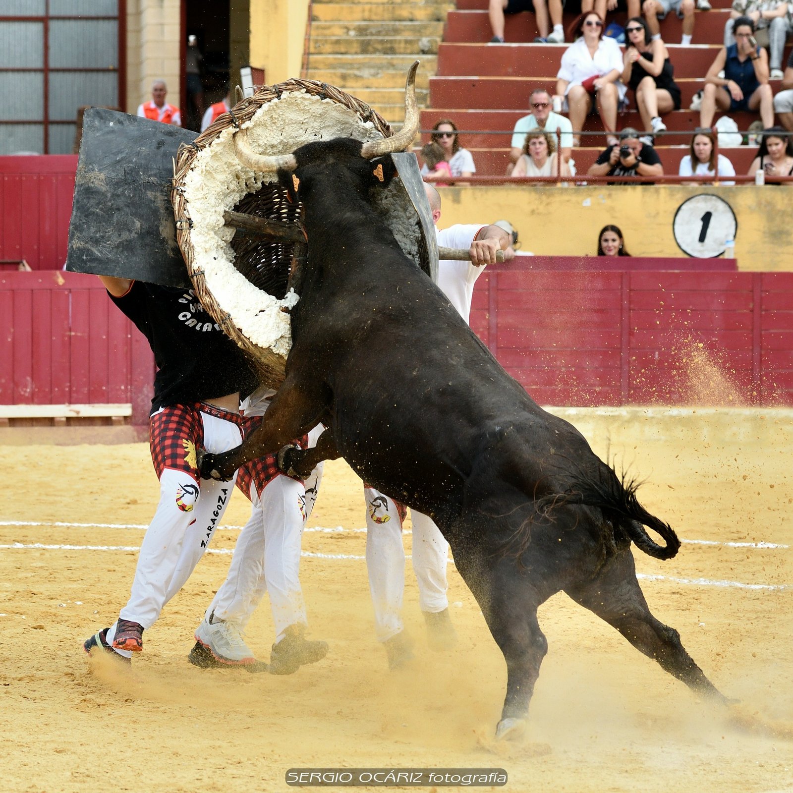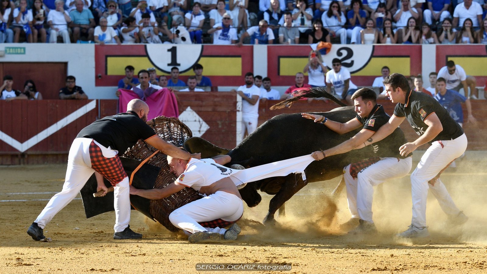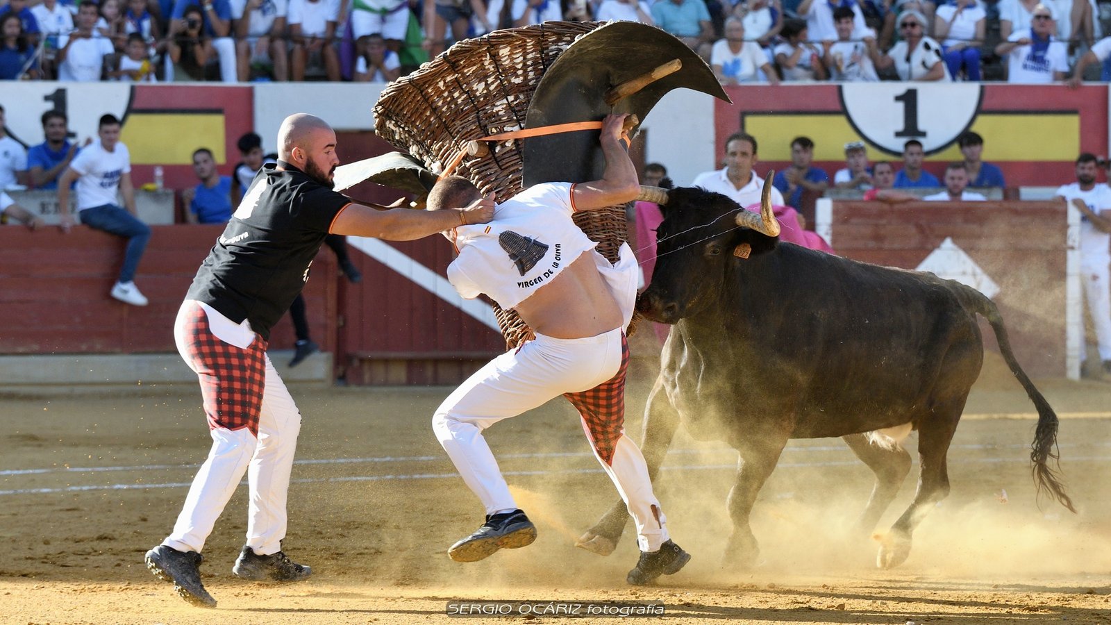 De salida, Héctor Colás, el citador, se la llevó muy bien hasta el burladero. Desde ahí la vaca arrancó con todo, pegó muy fuerte, desplazando a esta buena cuadrilla unos cuantos metros por el círculo central. Se medio enganchó en el cesto, y de la misma inercia y fuerza con la que pegaba, cayó al suelo, pegándose un costalazo. Se incorporó, y lo primero que buscó fue el mimbre. Entró un instante y se fue; parecía que iba a salir del círculo, pero no, la vaca tiene raza, y se volvió a por el cesto de nuevo, pegando brevemente de nuevo, pues en esas divisó a Héctor y se fue a por él del tirón, con ganas y pies.