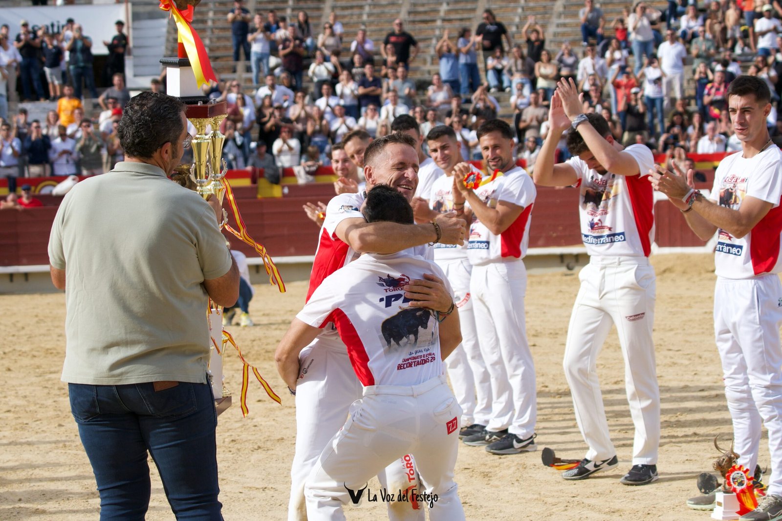 Y ahí estaba él, en los medios, en solitario, el nuevo Campeón de España, con una sonrisa de oreja a oreja, feliz. Don David Ramírez “El Peque”, que se volvió a tirar de rodillas ahí en los medios para hacerle una reverencia al público y rendirles un aplauso. Enfrente, su amigo, su compañero, un torero, le esperaba con el trofeo en las manos, mientras levantaba el puño en señal de victoria. Jonatan Estébanez “Peta” fue el encargado de entregárselo, tan feliz como el propio Peque. Cuando llegaron al encuentro, se olvidaron del trofeo y Peta levantó por los aires a David. Dos amigos, dos toreros, dos Leyendas, dos argandeños, dos personas muy felices.