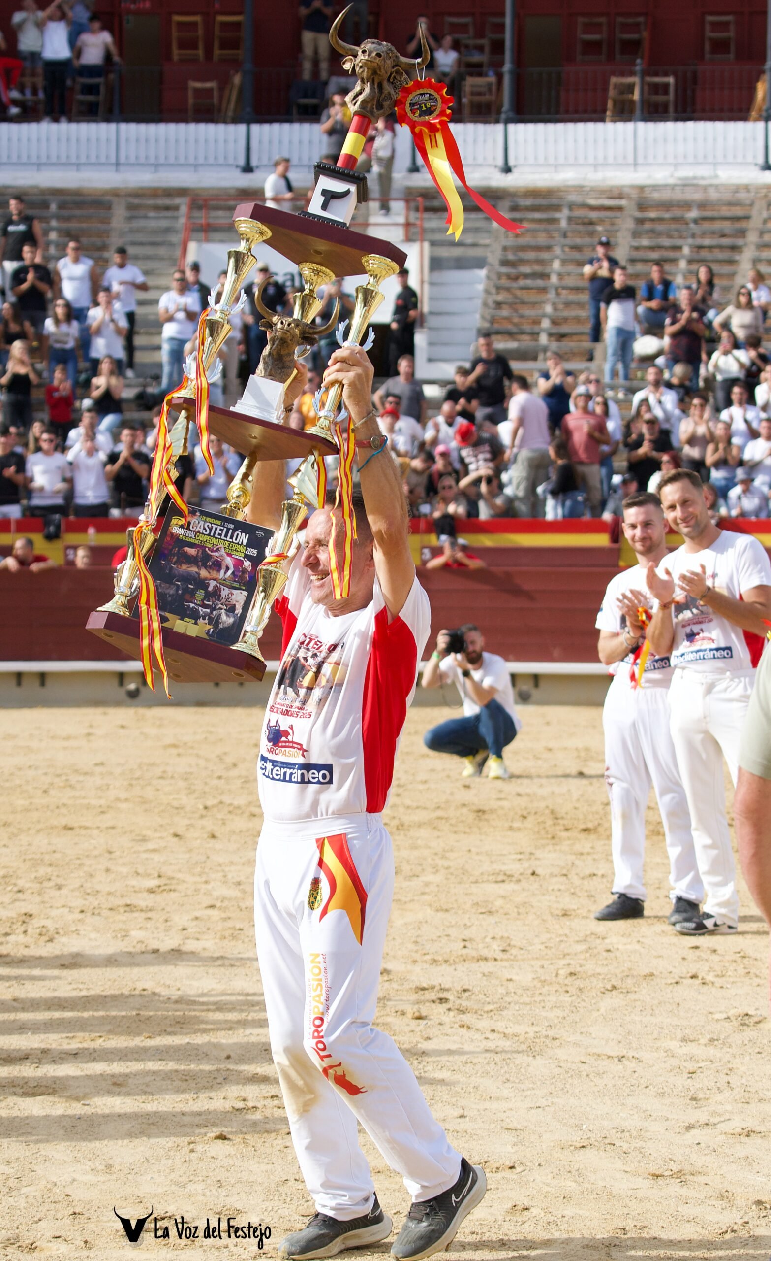 David, por fin, levantó el trofeo al cielo. Y Peta se fue a por él, y se lo subió a los hombros, y todos sus compañeros les acompañaron en una merecidísima vuelta al ruedo mientras no dejaban de aplaudir. Ayer, en Castellón, Don David Ramírez “El Peque” se alzó como Campeón de España después de 32 temporadas jugándose la vida tarde a tarde, luchando y trabajando como el que más por el festejo popular, por los recortadores, por el toro y por una forma de vida.