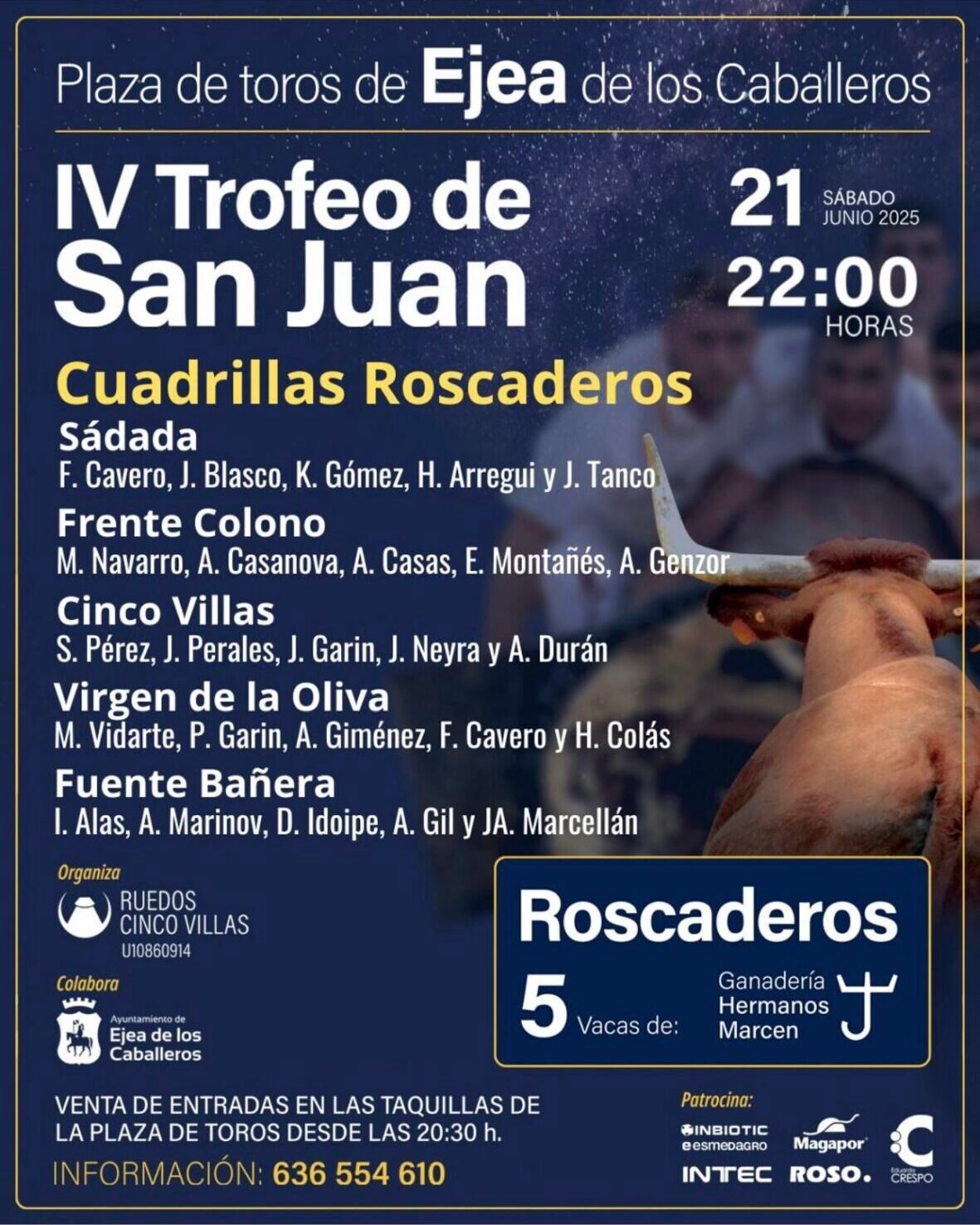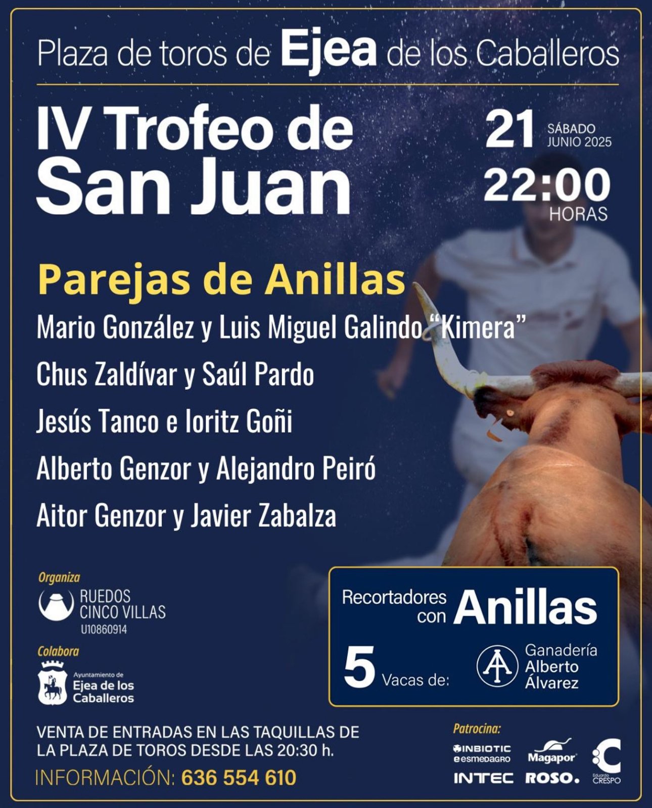 22:00 horas – IV Trofeo San Juan de Recortadores de Anillas y Roscaderos. Ganadería Hermanos Marcén