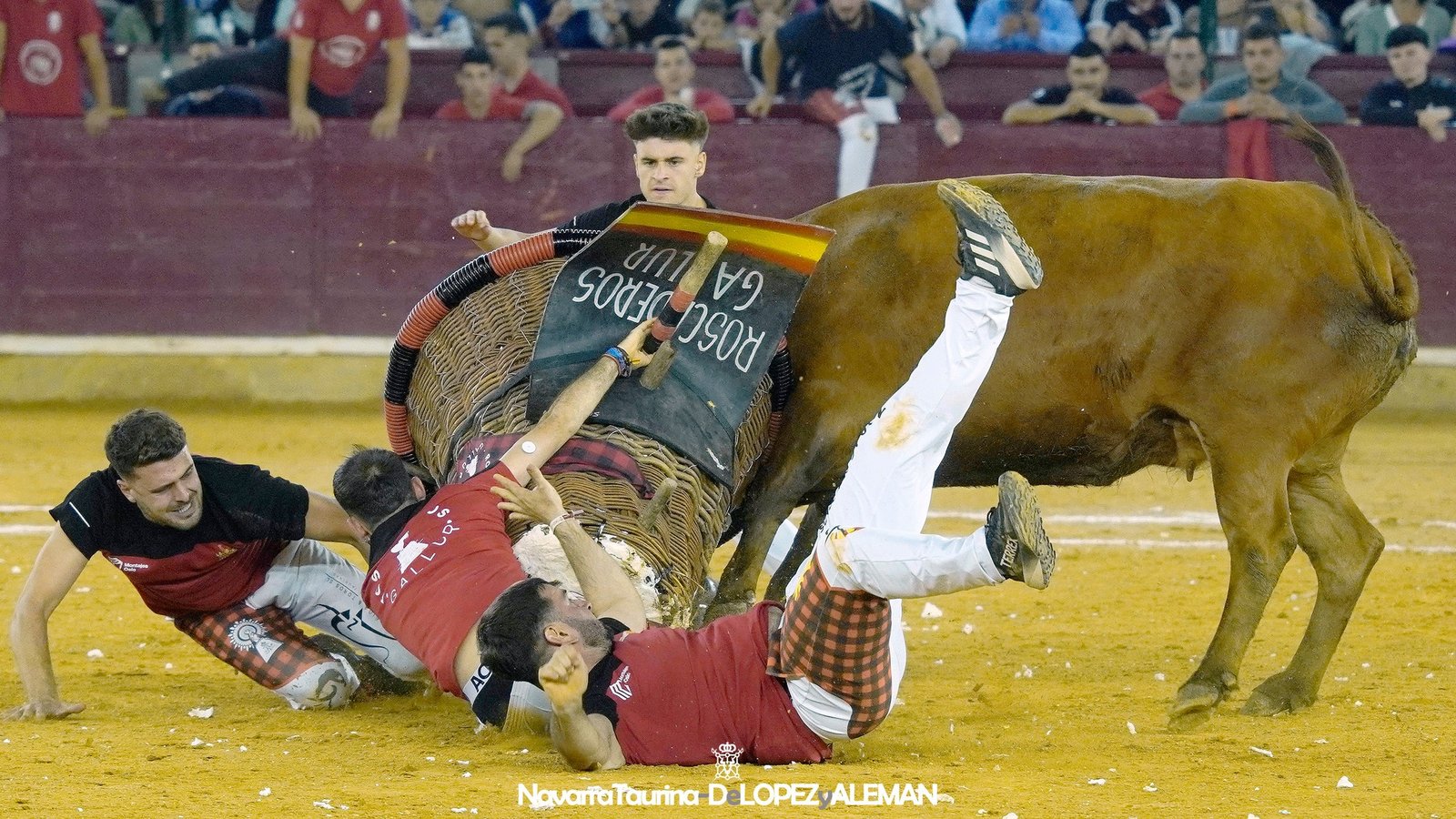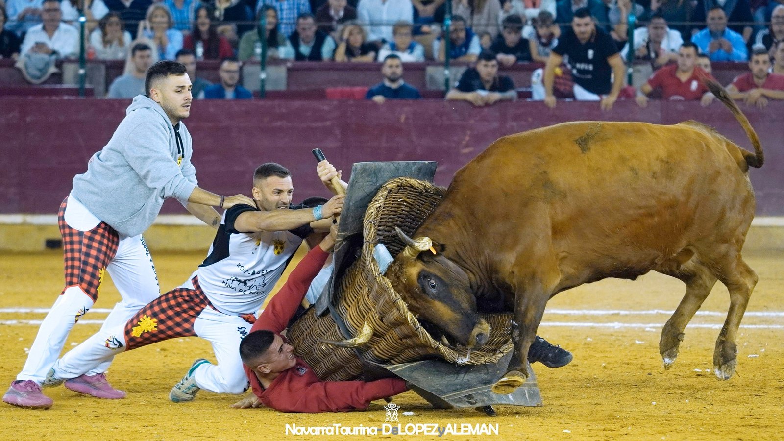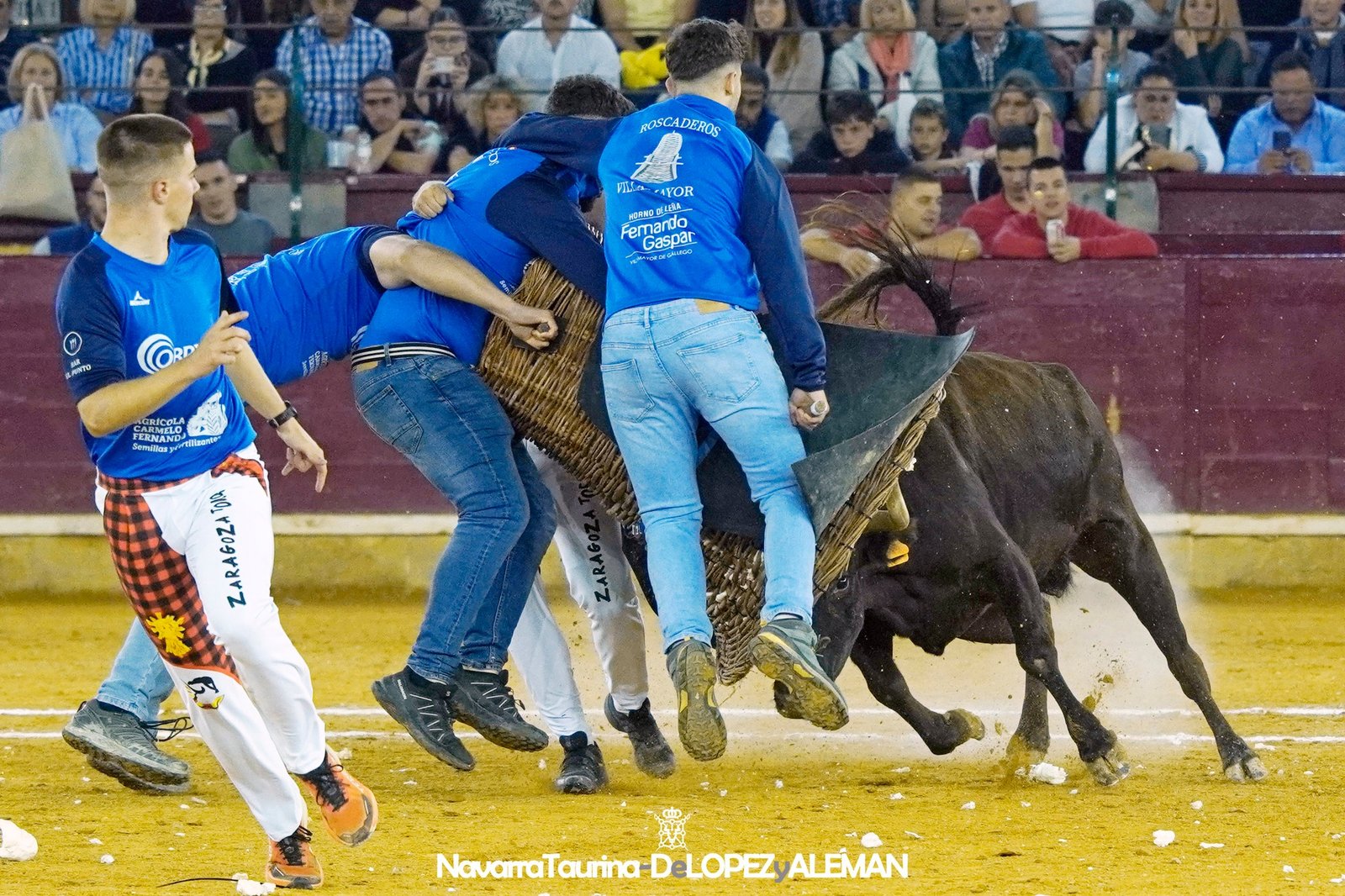 Desplazó a la cuadrilla y los arrolló, metiendo riñones, empujando con el alma. Javier Blasco, el pechuga de la cuadrilla, se aferró a los palos desde el suelo, con el cesto encima, aguantando él solo las embestidas y los cabeceos de la vaca. Sensacional. Mucha raza y valor la de este roscaderista cincovillés.