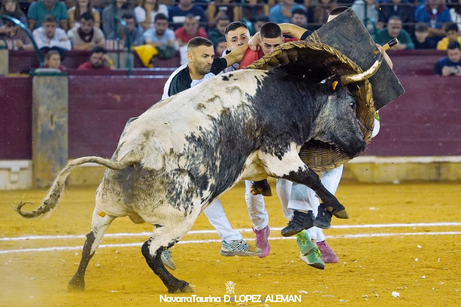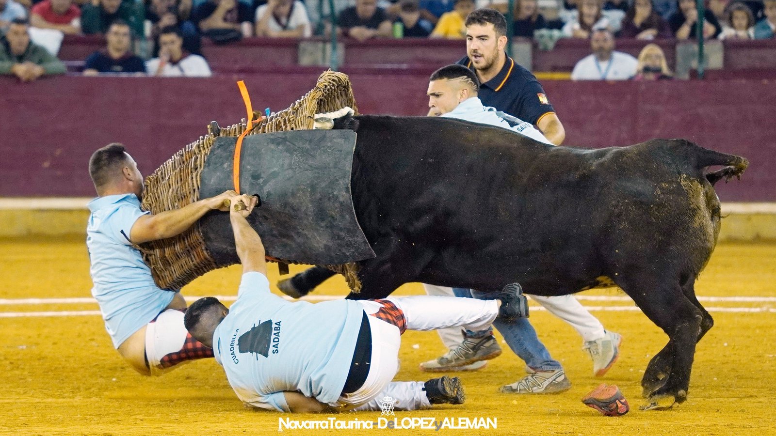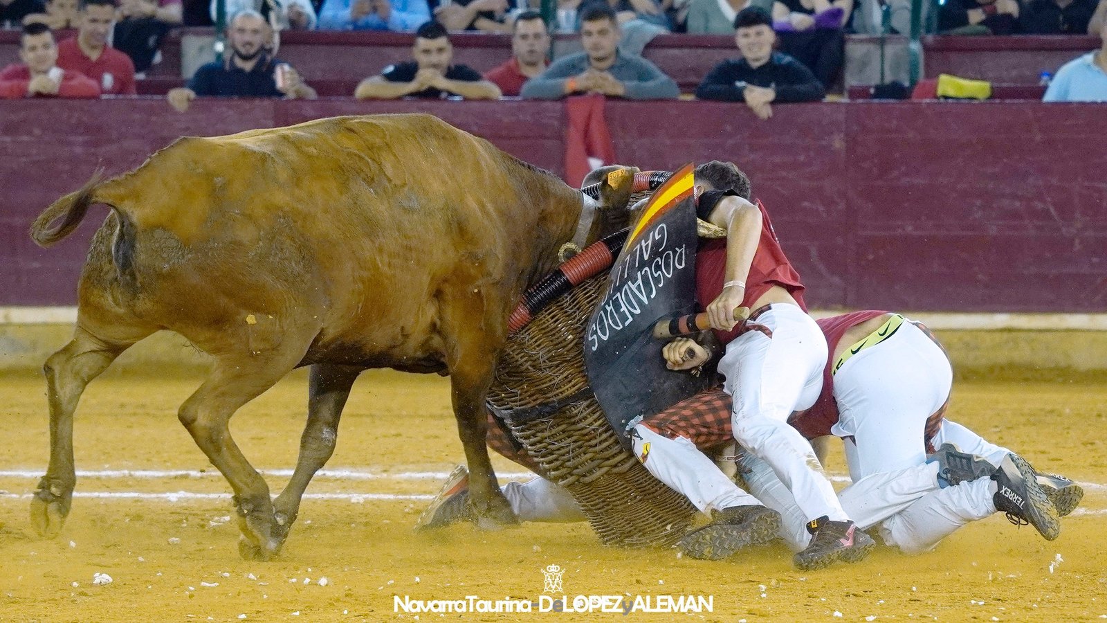 Desplazó a la cuadrilla y los arrolló, metiendo riñones, empujando con el alma. Javier Blasco, el pechuga de la cuadrilla, se aferró a los palos desde el suelo, con el cesto encima, aguantando él solo las embestidas y los cabeceos de la vaca. Sensacional. Mucha raza y valor la de este roscaderista cincovillés.