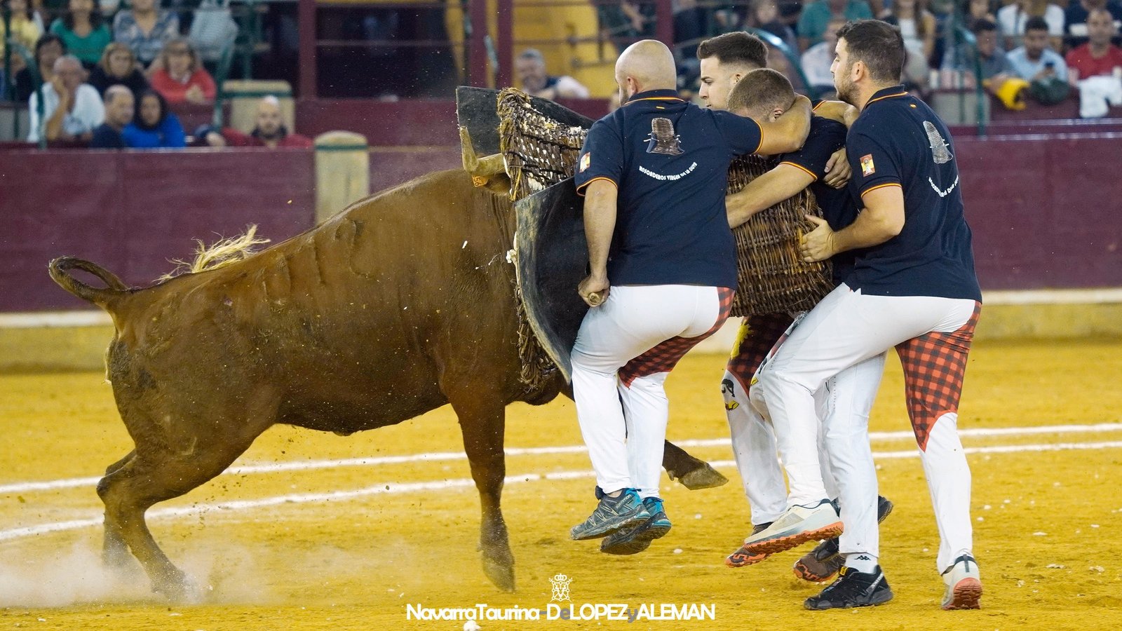 El séptimo acto duró un suspiro también. Fue el turno de la cuadrilla ejeana Frente Colono, capitaneada por Marcos Navarro. En suerte les correspondió una vaca de Hermanos Oliva muy guapa y con un precioso nombre: Triana. Esta vaca colorada, marcada con el número 233 en el costillar, salió sin mirar a Alberto Genzor, el citador, y se fue directa a los medios.