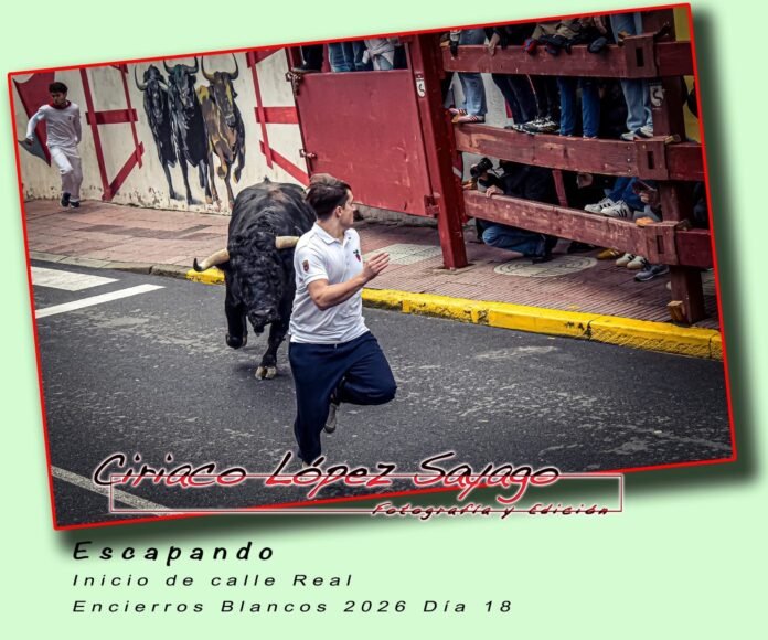 11 de la mañana en punto, cohete al cielo, portón abierto y manada al asfalto. Hoy, de nuevo, han sido los bueyes los que han tomado la delantera y han salido por delante, con cuatro berrendos en colorado mandando y abriendo la carrera. Los morlacos subían pegados, pero mirando, punteando y, en cuanto han visto a los primeros corredores, cruzándose a por ellos. Nada más comenzar Real Vieja hemos visto a un corredor librándose muy bien de la embestida que le ha lanzado uno de los bureles negros que se había ido directo a por él.