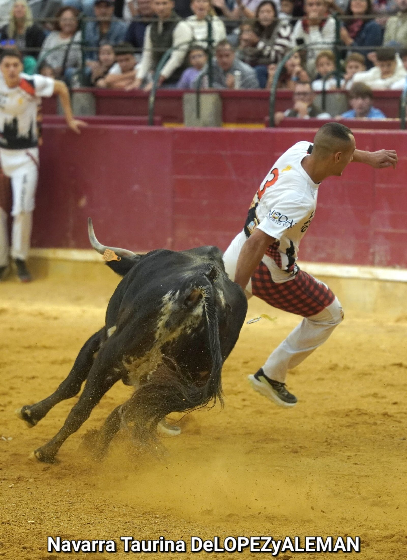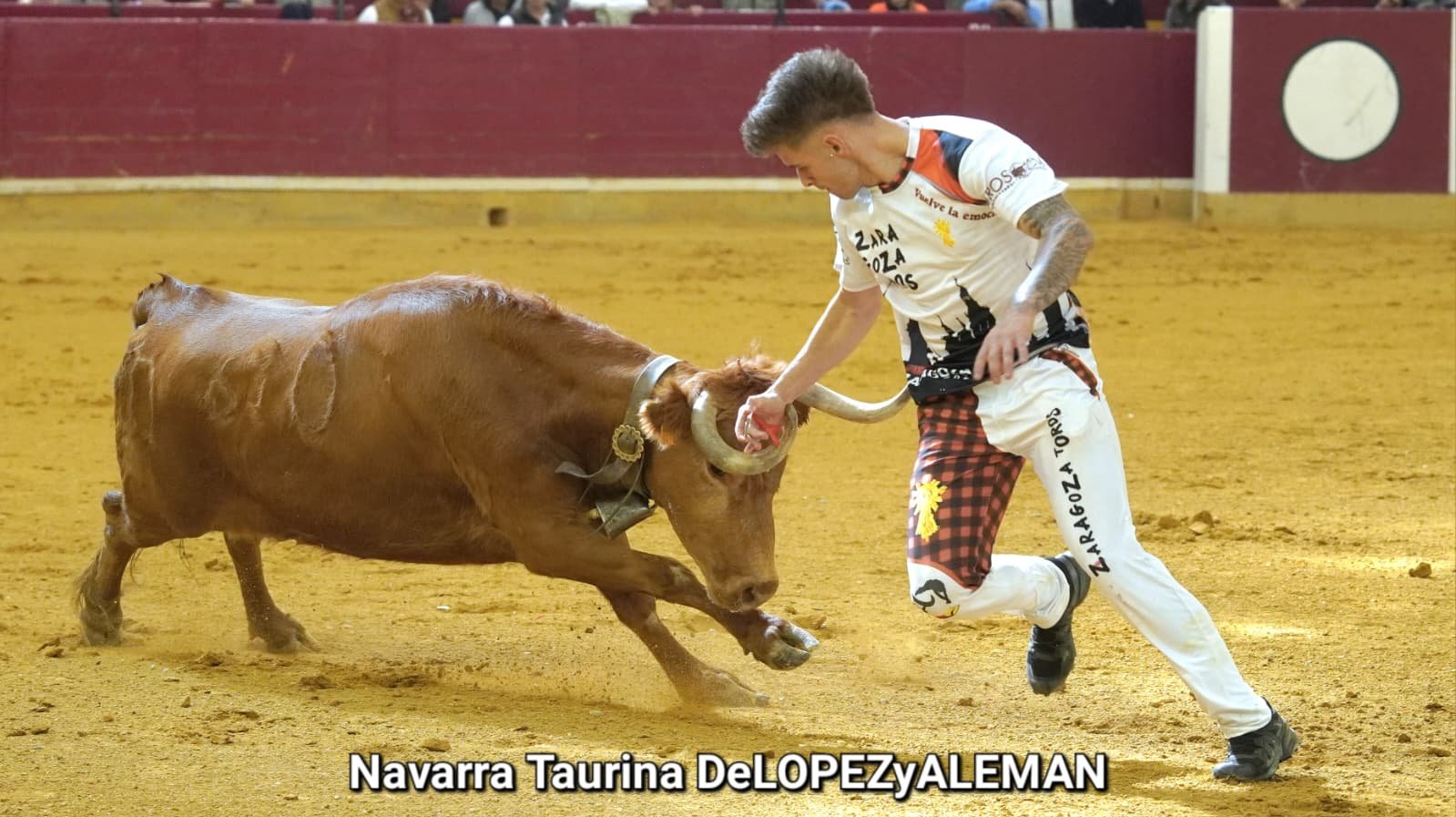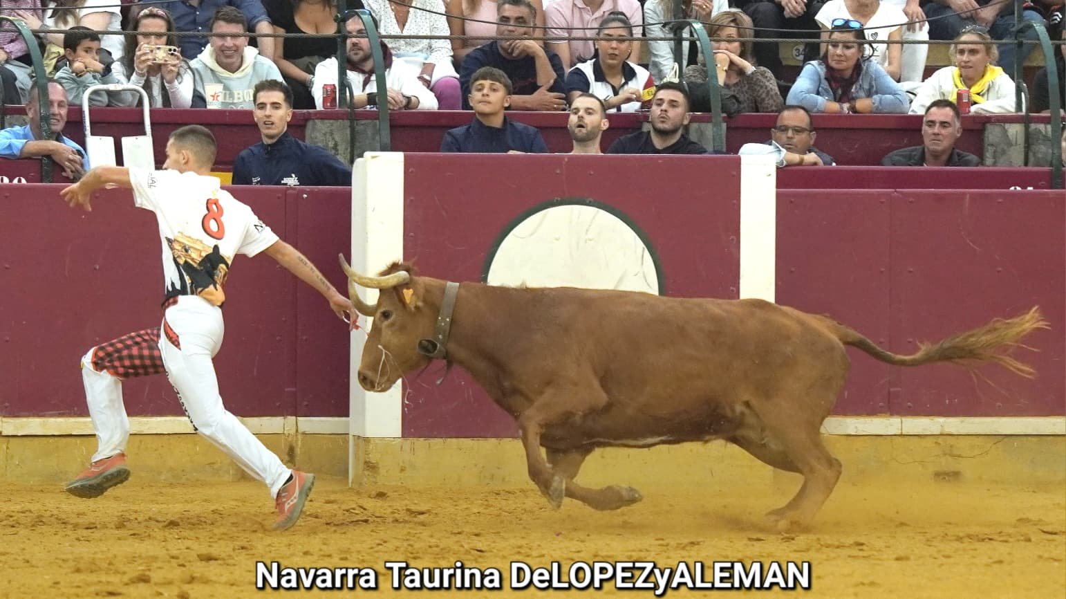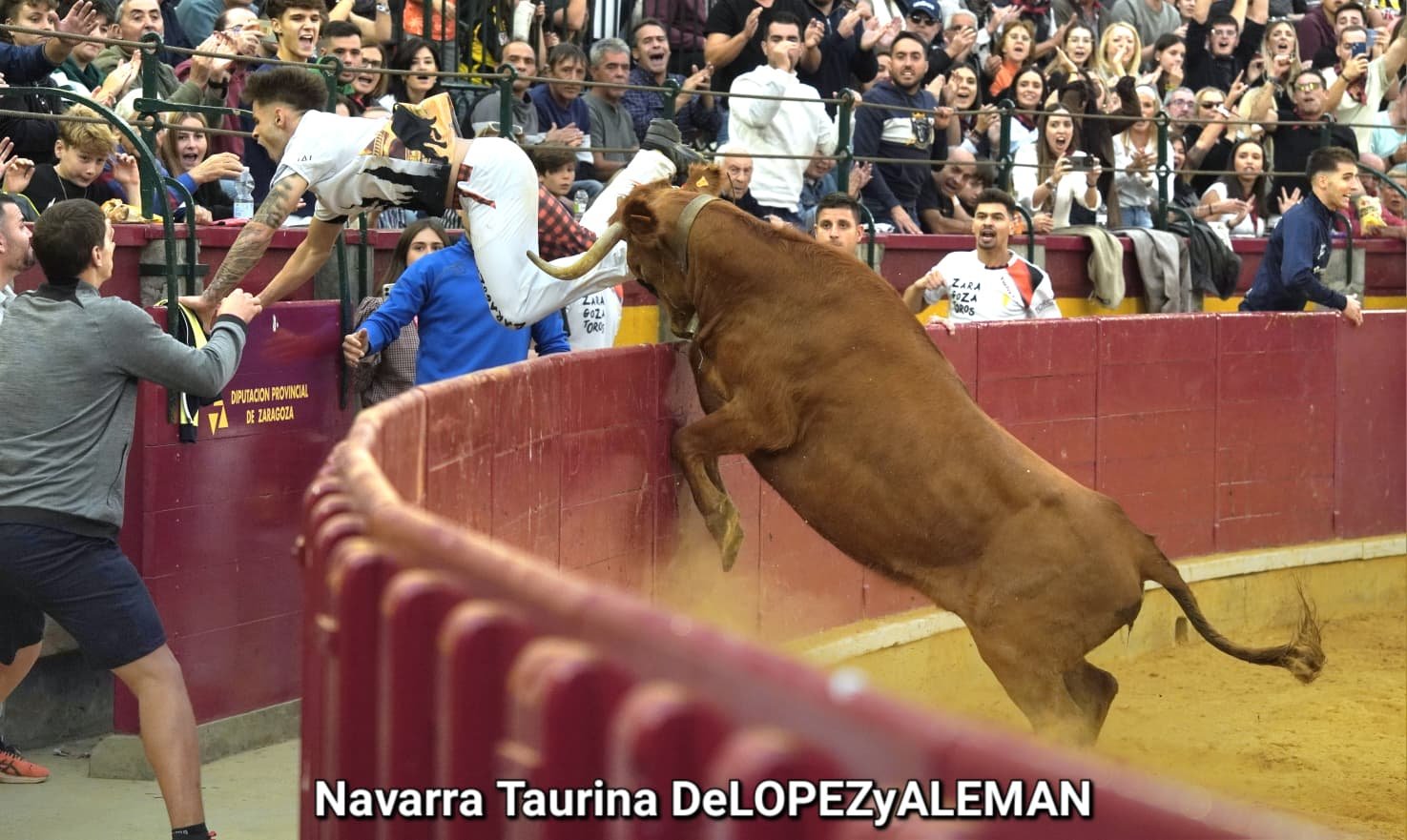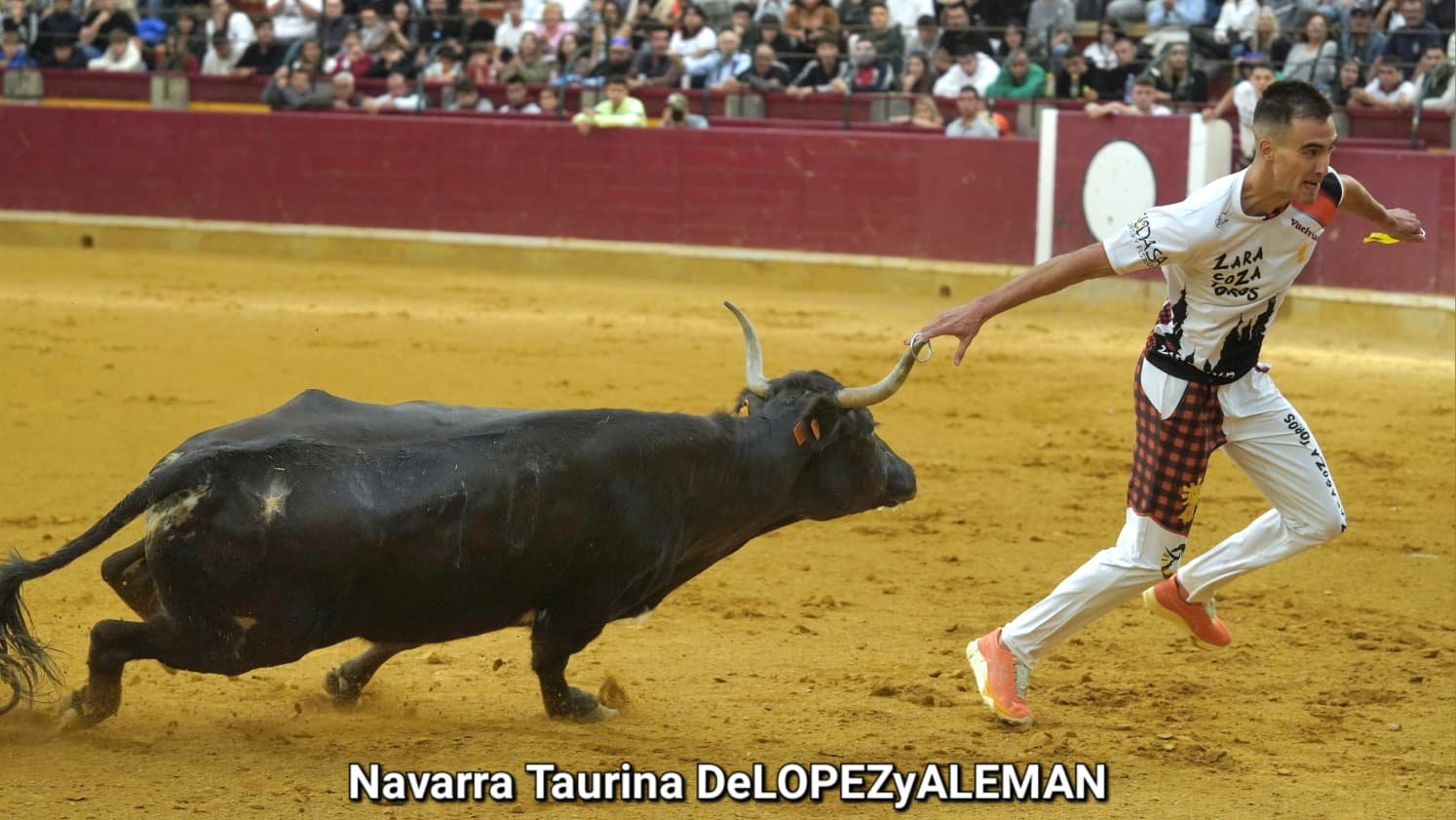 Juan Casos, de Zaragoza, ha sido el recortador que ha ocupado el puesto de Asier Estarriaga en la recta final de la temporada. Así pues, ha formado pareja con Edgar Teixeira, de Caparroso, para enfrentarse a Ribereña, marcada a fuego con el número 519 en los costillares. Una vaca colorada bragada axiblanca de Hermanos Oliva Escudero a la que han entendido pronto y bien.