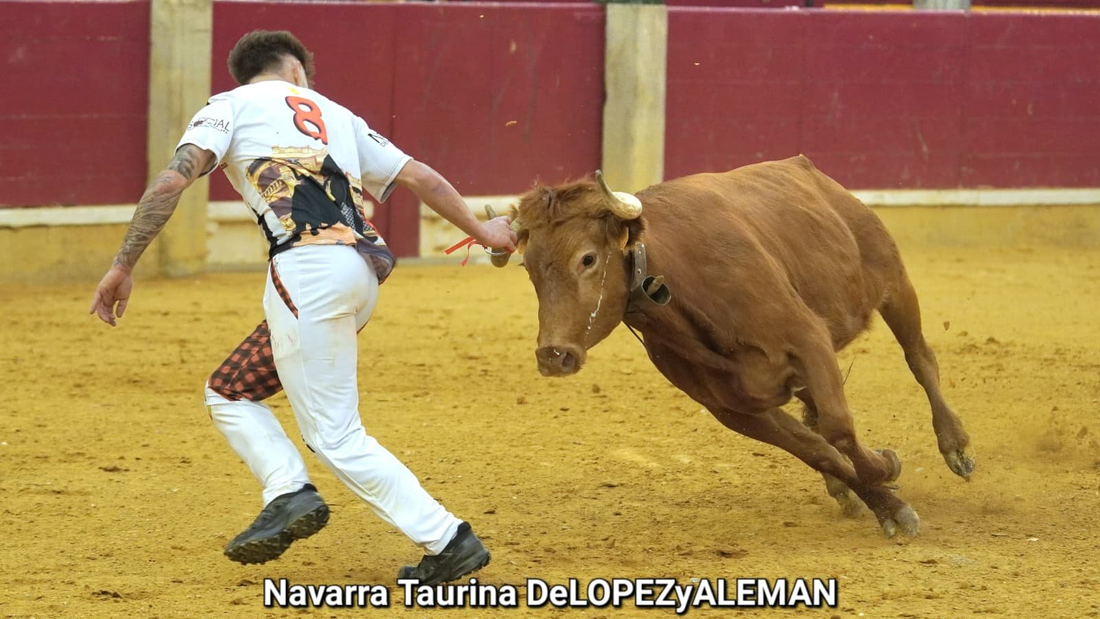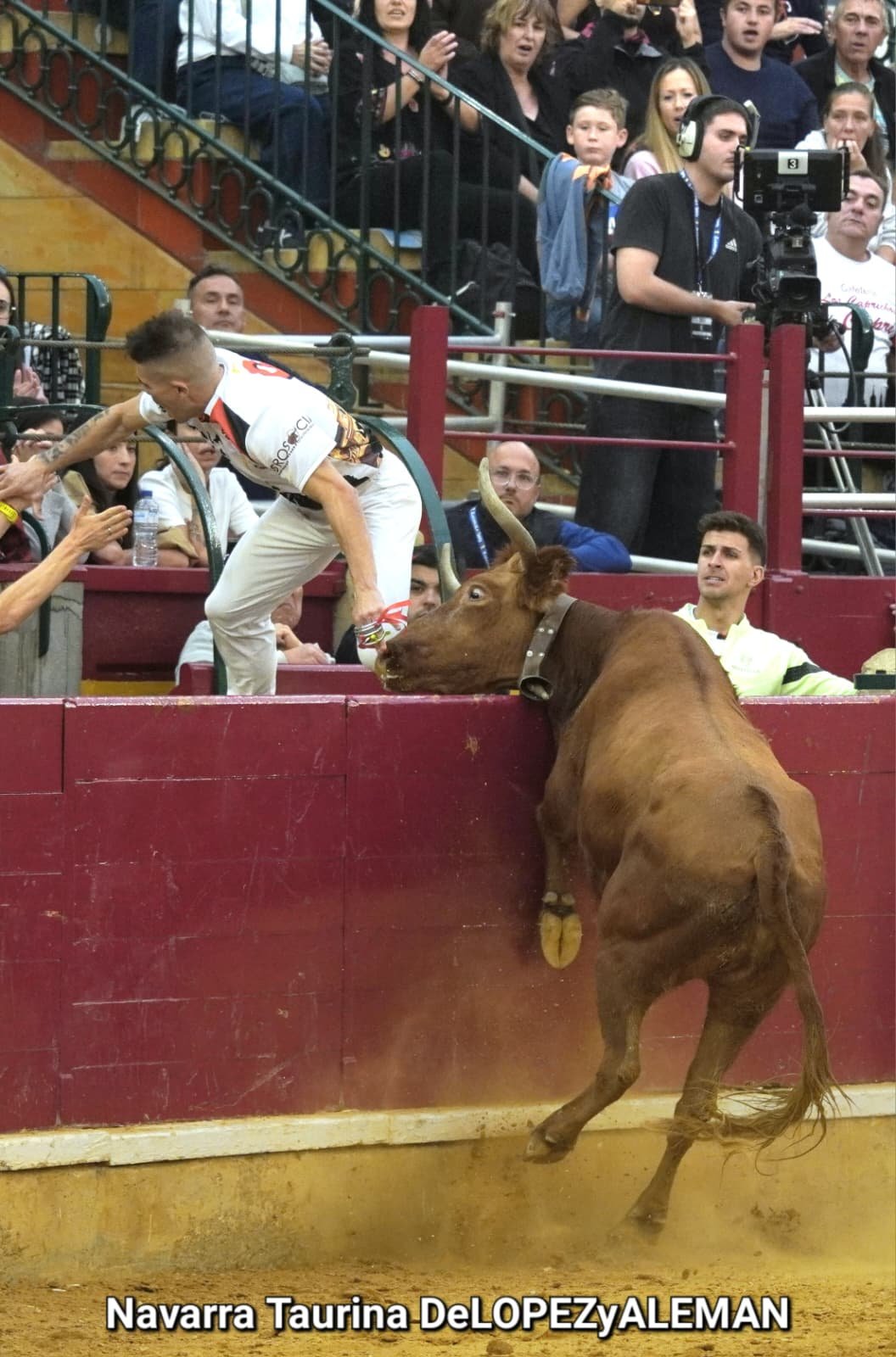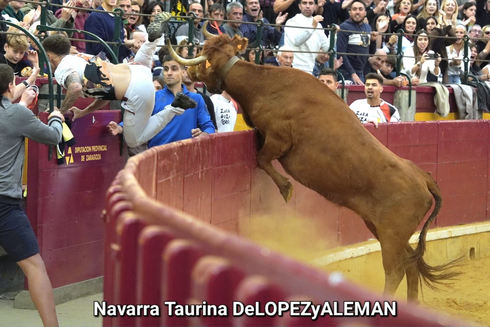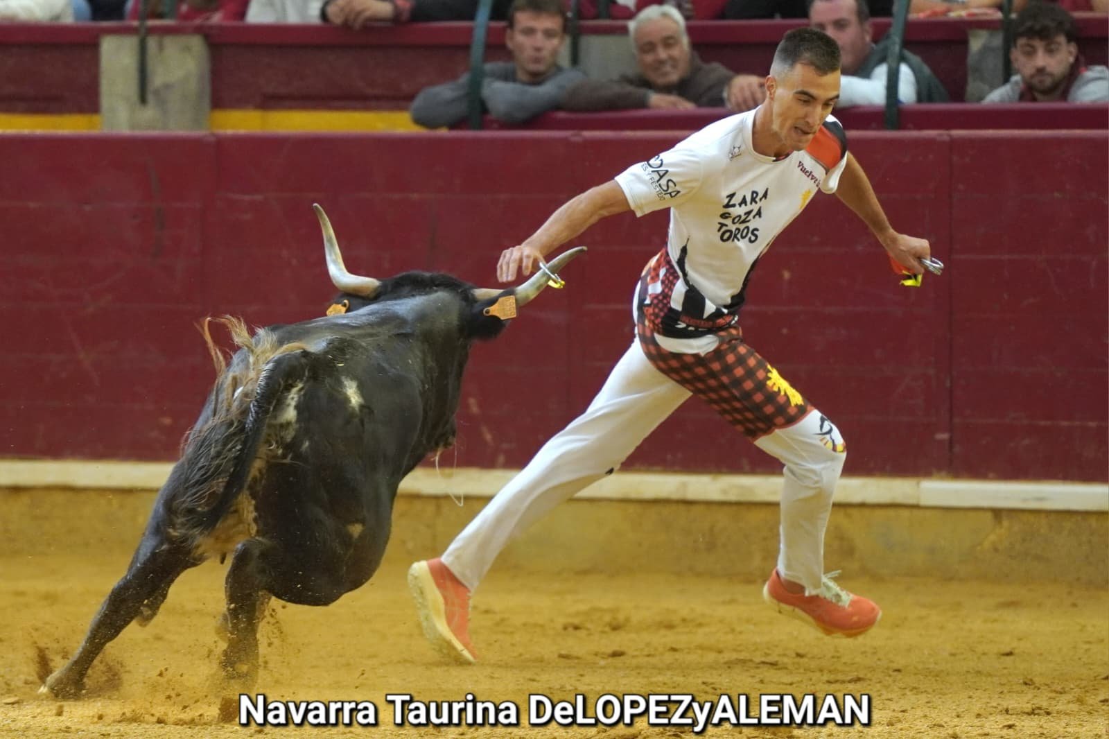 Juan Casos, de Zaragoza, ha sido el recortador que ha ocupado el puesto de Asier Estarriaga en la recta final de la temporada. Así pues, ha formado pareja con Edgar Teixeira, de Caparroso, para enfrentarse a Ribereña, marcada a fuego con el número 519 en los costillares. Una vaca colorada bragada axiblanca de Hermanos Oliva Escudero a la que han entendido pronto y bien.