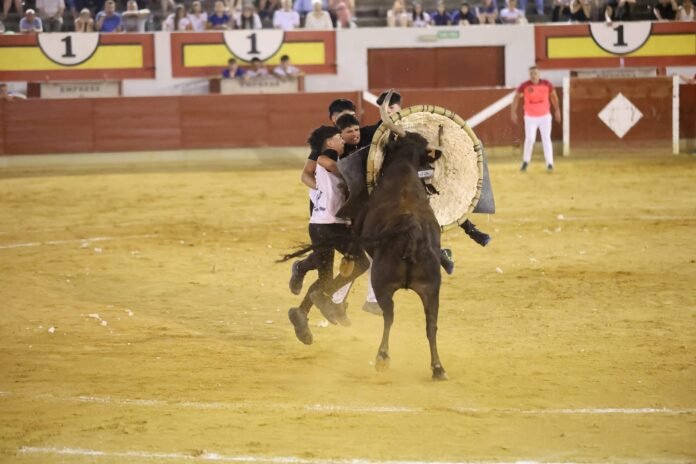 De salida, Héctor Colás, el citador, se la llevó muy bien hasta el burladero. Desde ahí la vaca arrancó con todo, pegó muy fuerte, desplazando a esta buena cuadrilla unos cuantos metros por el círculo central. Se medio enganchó en el cesto, y de la misma inercia y fuerza con la que pegaba, cayó al suelo, pegándose un costalazo. Se incorporó, y lo primero que buscó fue el mimbre. Entró un instante y se fue; parecía que iba a salir del círculo, pero no, la vaca tiene raza, y se volvió a por el cesto de nuevo, pegando brevemente de nuevo, pues en esas divisó a Héctor y se fue a por él del tirón, con ganas y pies.